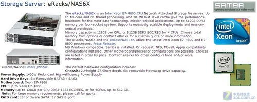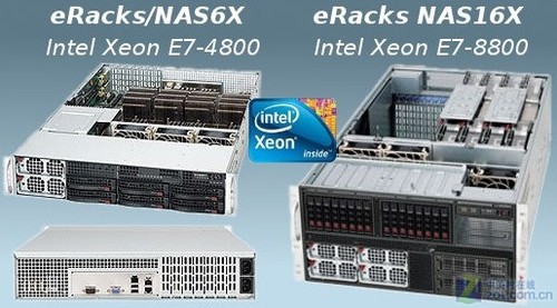 據國外媒體PRWeb最新報道,美國西部時間7月5日,PC廠商eRacks Open Source Systems宣布推出采用最新至強處理器的兩款NAS系列服務器,它們分別是eRacks/NAS6X和eRacks/NAS16X。這兩款產品主要針對大規模部署和關鍵業務應用。這兩款產品最多可以支持4個或者8個CPU,每個處理器支持最高10個內核和30MB的緩存。