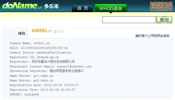 這數萬個.cn域名的DNS均設置為go1.cdns.cn和go2.cdns.cn。而我們通過域名WHOIS信息查詢可知,這2組DNS為中國互聯網絡信息中心所有,也就是cnnic。這正是與前幾日報道的騰訊與cnnic合作,CN域名可成為QQ空間入口相吻合。并且這些域名到期時間全部為2014年。騰訊和CNNIC合作的合約難道為2年期?