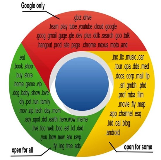 據ICANN稱,新提出的通用頂級域名共有1900多個,其中谷歌申請的新頂級域名有101個,比如“.google”、“.chrome”、“.gmail”、“.goog”和“.youtube”等。除了這些具有強烈的谷歌特色的域名之外,它還申請了一些任何組織都可以使用的頂級域名,包括“.search”、“.app”、“.blog”和“.cloud”等。