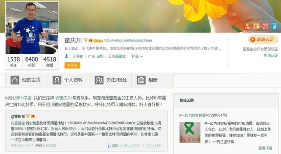 昨日下午,霍慶川在微博上宣布,壹基金已經(jīng)收到意向捐贈(zèng)50Btc(按照當(dāng)日匯率,折合人民幣4萬(wàn)元)并將委托中國(guó)比特幣公社出售募捐到的比特幣,同時(shí)歡迎極客和駭客們向壹基金捐贈(zèng)比特幣。之后,比特幣中國(guó)宣布,決定向壹基金捐贈(zèng)15比特幣,用于四川雅安地震的緊急救災(zāi)。