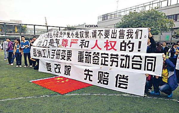 11月19日,一名諾基亞東莞工廠的員工在微博爆料稱,諾基亞東莞制造工廠的員工認為諾基亞出售手機業務的過程中未能獲得合理經濟補償,約有百名員工參與了抗議停工活動。根據爆料微博,當天諾基亞東莞工廠的員工在園區內的空地上打出了維權橫幅,并在草地上靜坐表示抗議。