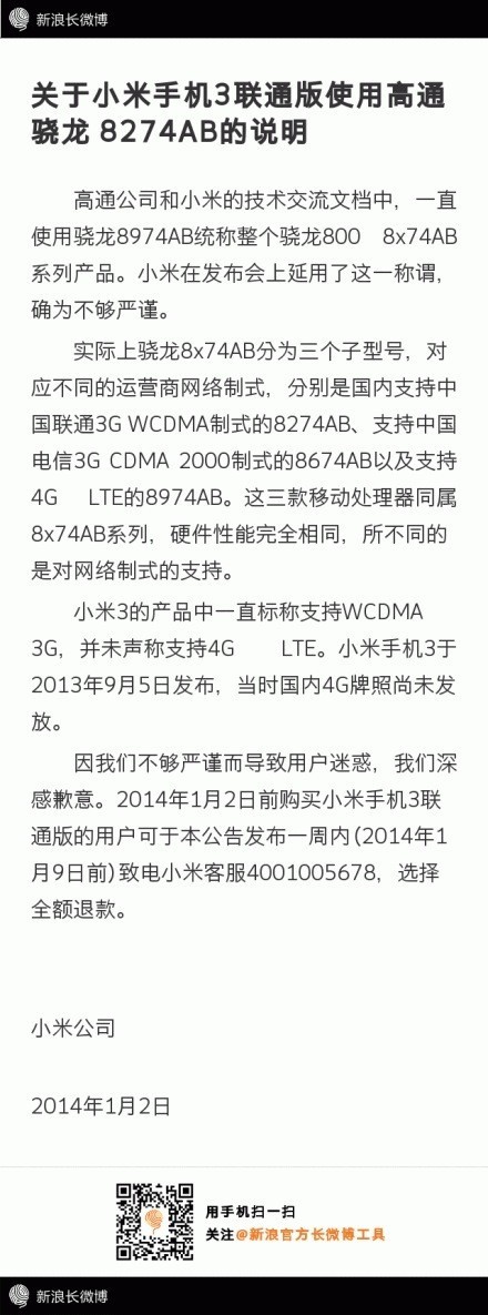 1月2日消息,針對網(wǎng)友有關小米手機3聯(lián)通版偷換CPU的質(zhì)疑,小米公司今天下午發(fā)布微博向用戶致歉,稱小米與高通一直使用驍龍8974AB統(tǒng)稱整個驍龍800 8x74AB系列產(chǎn)品,措辭上不夠嚴謹,并接受2014年1月2日前購買小米手機3聯(lián)通版用戶的全額退款。