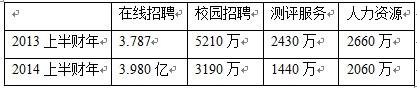 (1)在截至2013年12月31日的2014上半財年,智聯招聘總營收為人民幣5.010億元(約合8270美元),高于前一財年的人民幣4.456億元,增長12.4%。收入具體構成如下: