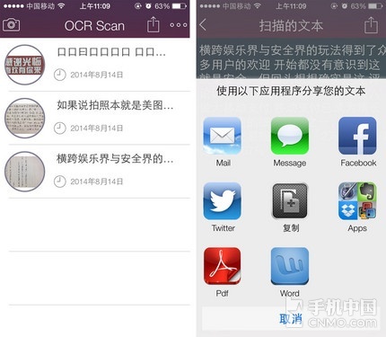 《光學(xué)字符識別》的使用方法非常簡單,只要對準(zhǔn)要編輯的文本拍下一張照片即可,別忘了選擇一下需要翻譯的語言,應(yīng)用會自動對圖片中的文本進(jìn)行識 別。小編測試了幾個不同字體不同材質(zhì)的圖片,白色打印紙黑色字體識別率最高,雜志印刷效果次之,而色彩差異比較大的廣告單頁則效果不太好。不過“翻譯”的 時間有點長,需要耐心等待一小會,但肯定比打字要來的快多了。