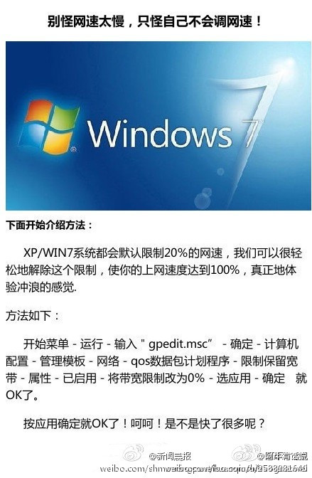 【別怪網(wǎng)速太慢,只怪自己不會(huì)調(diào)網(wǎng)速!】XP/WIN7系統(tǒng)都會(huì)默認(rèn)限制20%的網(wǎng)速,我們可以很輕松地解除這個(gè)限制,使你的上網(wǎng)速度達(dá)到100%,真正地體驗(yàn)沖浪的感覺(jué)~!