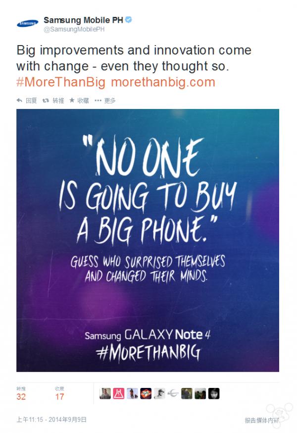 威鋒網 9 月 10 日消息,今天凌晨蘋果在自己的秋季產品發布會上發布新款的 iPhone 手機,iPhone 6 和 iPhone Plus。兩款新 iPhone 都使用大屏的設計理念,并喊出了“Bigger than bigger”的口號。而就在這兩款新的 iPhone 發布之后三星菲律賓就在推特上引用了喬布斯的當年所說過的“沒有人會想要購買大屏手機”來嘲諷蘋果推大屏 iPhone 的行為,并且表示“猜猜是誰讓他們(蘋果)最終改變了不推大屏手機的想法”。