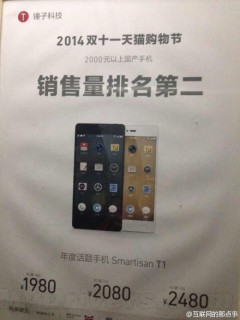原來如此。根據之前錘子官方公布的數據,雙十一錘子科技天貓旗艦店共售出12792部Smartisan T1手機,在天貓的手機品牌中排名第五。
