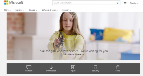 目前,微軟官網(wǎng)首頁(yè)的重點(diǎn)是婦女影響技術(shù),這是一個(gè)敏感的話題,因?yàn)榭萍紭I(yè)傳統(tǒng)上由男性主導(dǎo)。就目前的布局而言,英雄形象的重點(diǎn)是對(duì)科學(xué)感興趣的少女,而頁(yè)腳圖像是11位女性科技業(yè)領(lǐng)導(dǎo)者,她們正在改變創(chuàng)新生態(tài)系統(tǒng)。