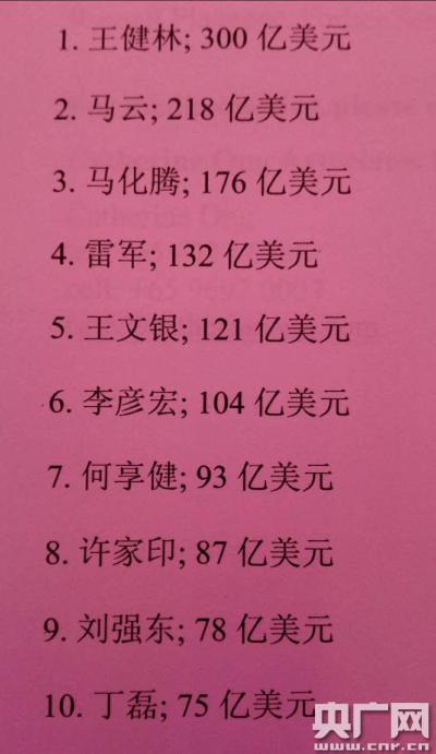 26日,《福布斯》雜志在京發布2015年福布斯中國富豪榜,萬達集團董事長王健林勝過馬云,重回首富寶座 馬云由第一位跌至第二位,馬化騰則繼續維持第三位。前十位有6位來自互聯網行業。2015年福布斯中國富豪榜上前100名成員的財富總和從一年前的3760億美元增至4500億美元,增幅近20%。