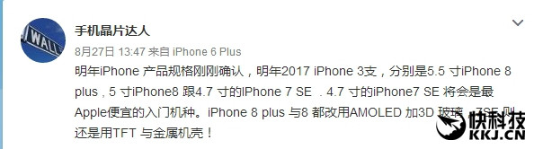 此外,消息人士還強調,2017年的iPhone將有三款,一個是5.5寸的iPhone 8 Plus,一個是5寸iPhone 8,至于4.7寸的iPhone SE將成為蘋果便宜的入門機型,其會使用TFT材質屏幕和金屬外殼,而iPhone 8系列將是AMOLED屏幕,機身為雙面3D玻璃。