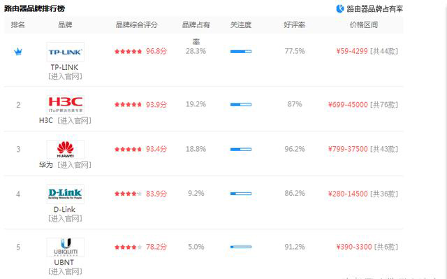 前五名榜首依次為TP-LINK、H3C、華為、D-LINK、UBNT,這個產品的排名說明了2個問題。