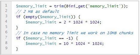 說明:首選讀取php.ini配置文件中的內(nèi)存配置選項memory_limit,如果為空則默認內(nèi)存大小限制為2M,如果沒有限制則內(nèi)存大小限制為10M,你可以結(jié)合你php.ini配置文件中的相關(guān)信息修改這段代碼。